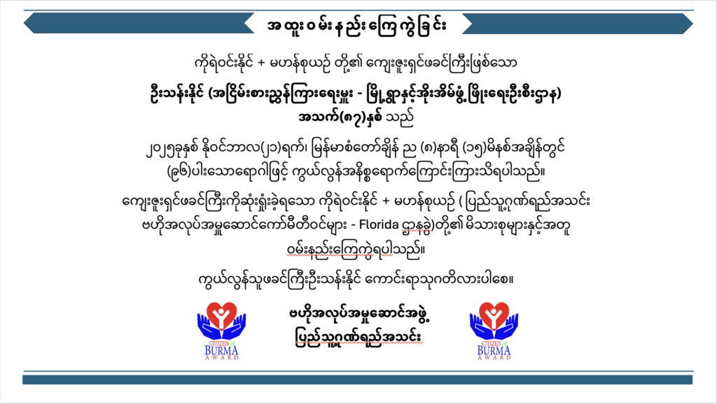 COBA is a nonprofit organization founded in 2010 to recognize, appreciate, and honor volunteer Burmese individuals and organizations who contribute their knowledge, labor, skills, and resources toward social services and charities for the Burmese community inside Burma