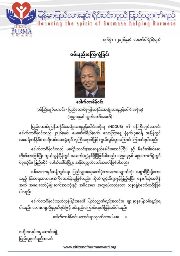 COBA is a nonprofit organization founded in 2010 to recognize, appreciate, and honor volunteer Burmese individuals and organizations who contribute their knowledge, labor, skills, and resources toward social services and charities for the Burmese community inside Burma